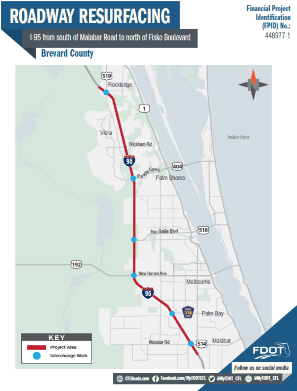 - Affected Interchanges: Malabar Road, Palm Bay Road, U.S. 192, Eau Gallie Boulevard (S.R. 518), Pineda Causeway (S.R. 404), Wickham Road, and Fiske Boulevard