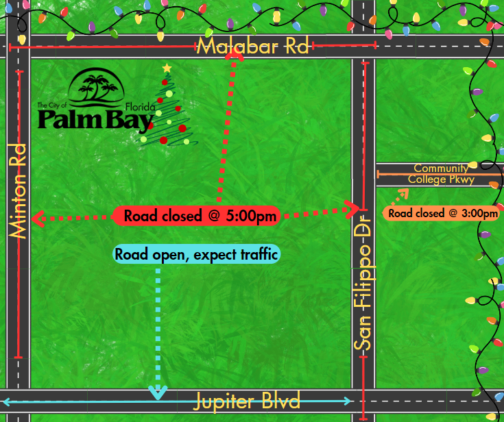 To accommodate the parade, several roads in Palm Bay will be closed at different times throughout the day. Please plan your route accordingly and expect delays in the surrounding areas. Here are the specific road closures for Saturday, December 7th: