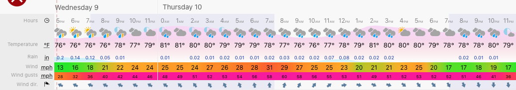 Windy.com rain and wind forecast for Palm Bay as of 1700 10/9/24