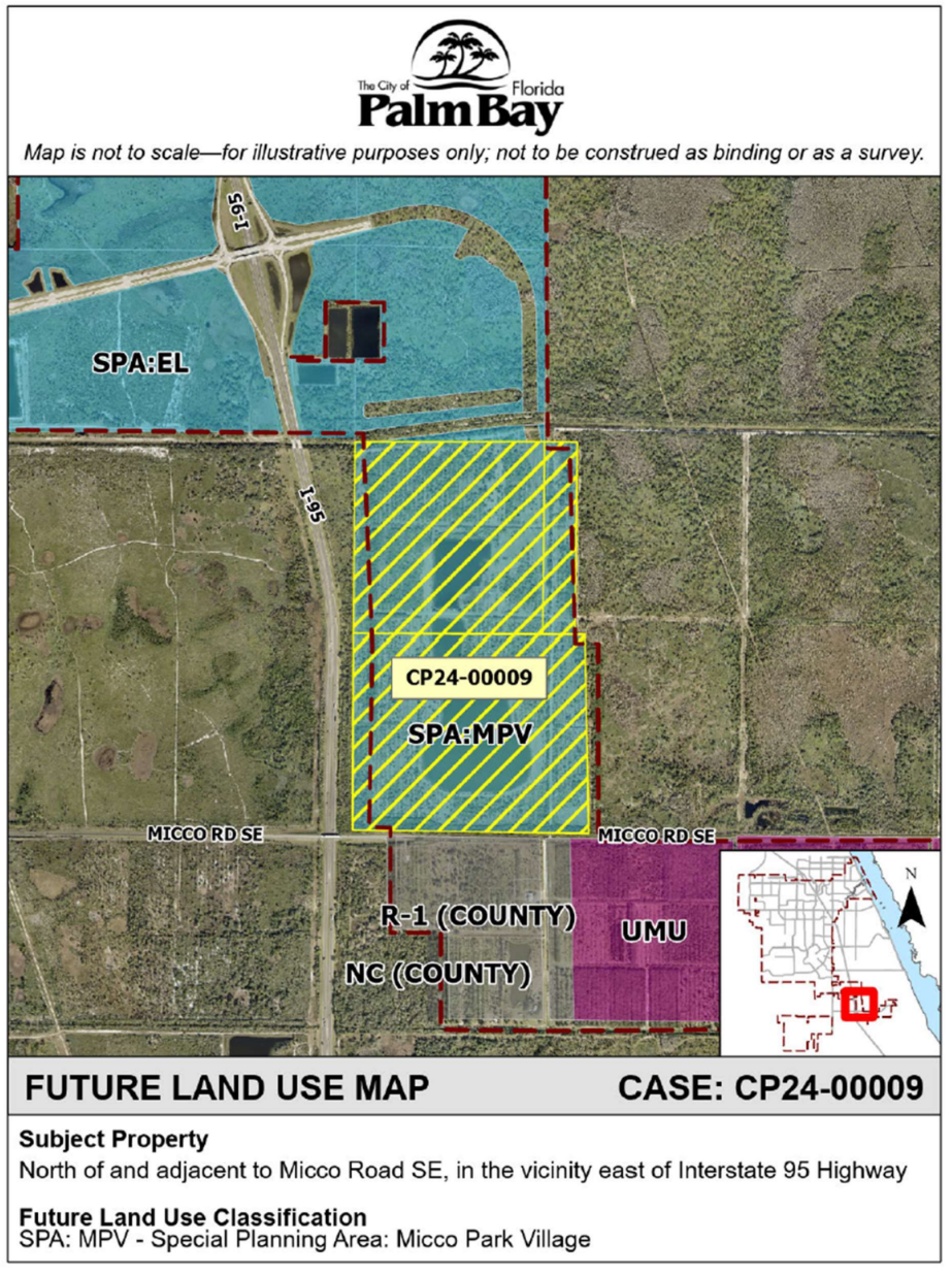 One of the first action items on the agenda will be a public hearing regarding Ordinance 2024-54, which proposes a change in the land use designation for 353.47 acres near Micco Road, east of Interstate 95. The land, currently designated as Micco Park Village, could be changed to Parkway Flex Use, a mixed-use designation aimed at fostering residential and commercial development. The development, known as Lotis Palm Bay, aims to create a walkable community featuring a blend of single-family homes, townhomes, and commercial spaces. The development is expected to provide community benefits such as reduced traffic congestion, local amenities, and an improved quality of life for residents. The property is located north of Micco Road, just east of Interstate 95.