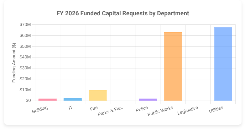 The budget also includes the adoption of the city’s five-year Capital Improvements Program (CIP). For Fiscal Year 2026, the CIP allocates $146.5 million for funded projects across eight city departments. However, there remains a significant gap, with over $15.3 million in requested projects going unfunded for the upcoming year, including $6.4 million in the General Fund alone.