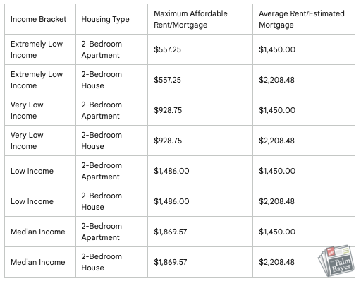 The following matrix illustrates the affordability challenges in Palm Bay, considering various income levels, housing types, and the impact of additional costs. The Area Median Income (AMI) for Palm Bay is $74,100 for a family of four.