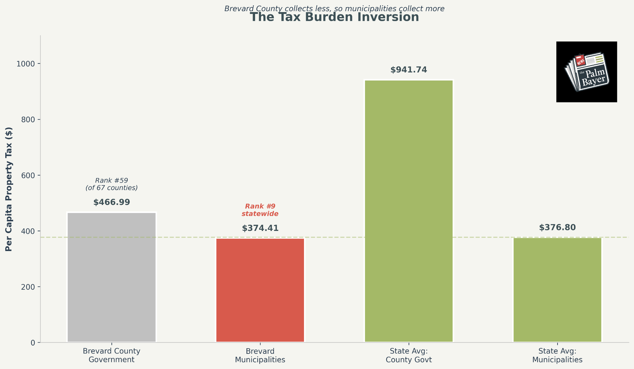 Brevard’s municipal tax levy inverts the county-low tax burden pattern.