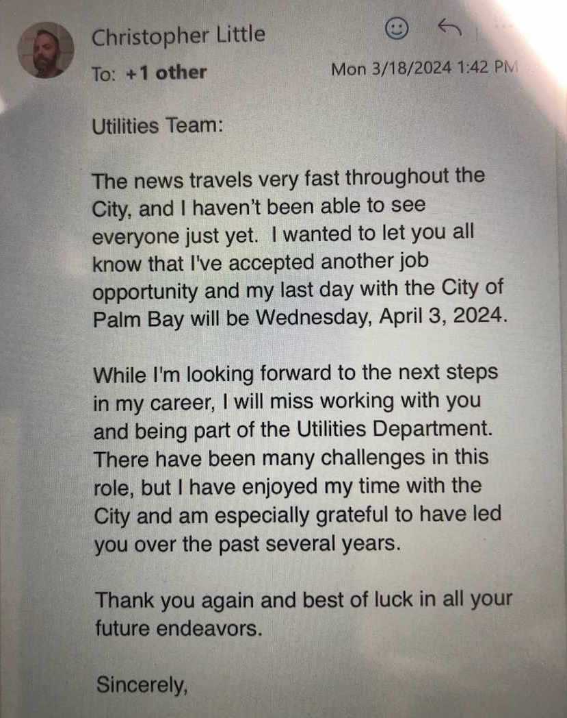 Christopher Little, who has played a pivotal role in steering the Utilities Department, announced his resignation in an email to his team. His last day with the city coincides with a critical juncture for Palm Bay, as the first notification letters to homeowners regarding the utility mandate are set to be dispatched in less than 90 days. Little’s resignation, attributed to his acceptance of a new job opportunity, marks the end of an era of leadership that saw the city through various challenges and achievements in the utilities sector.
