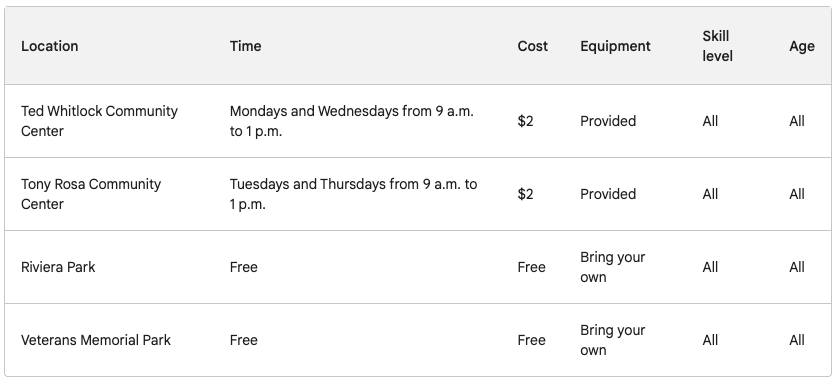 The city also has outdoor pickleball courts available at Riviera Park, 550 Riviera Dr. NE, and Veterans Memorial Park, 2201 Port Malabar Blvd NE. Outdoor courts are free to use and are available on a first come, first served basis. Outdoor users must bring their own paddles and balls.