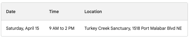 The event will be held at the Turkey Creek Sanctuary, located at 1518 Port Malabar Blvd NE, Palm Bay, FL 32905. For more information, visit www.pbfl.org/events.
